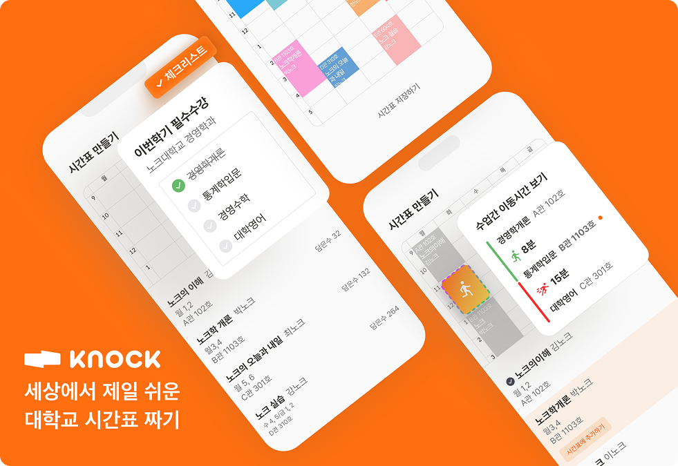 “생활밀착형 서비스 노크는 대학생이 캠퍼스 생활에서 겪는 다양한 불편함을 노크에서 안전하게 해결하도록 돕는 AI기반 커뮤니티 서비스다. 시간표 관리, 강의 정보 공유 및 교환, 대학생 간 소셜링 등 대학 생활 전반의 니즈를 충족시키고 있다. ”